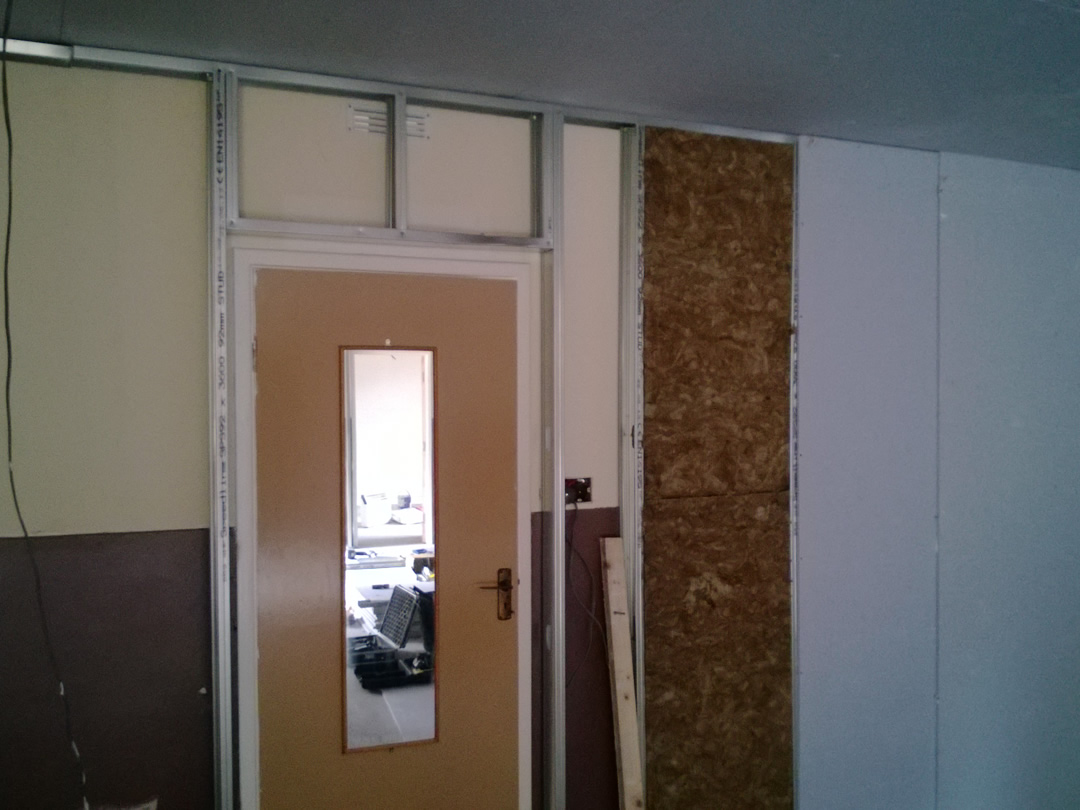 Using metal studwork, 100mm thick sound-proofing and double layered acoustic plasterboard, we created an "room within a room" in order to provide maximal acoustic efficiency and prevent leakage of sound to our close neighbours surrounding the building. We then taped the seams before all hands were on deck from band members and friends to paint the building inside and out and from floor to ceiling. We created homemade acoustic diffusers and acoustic absorption panels to temper the noise within the band hall. The floor was laid, the electrics were fitted and the furniture and percussion was installed before our first rehearsal.